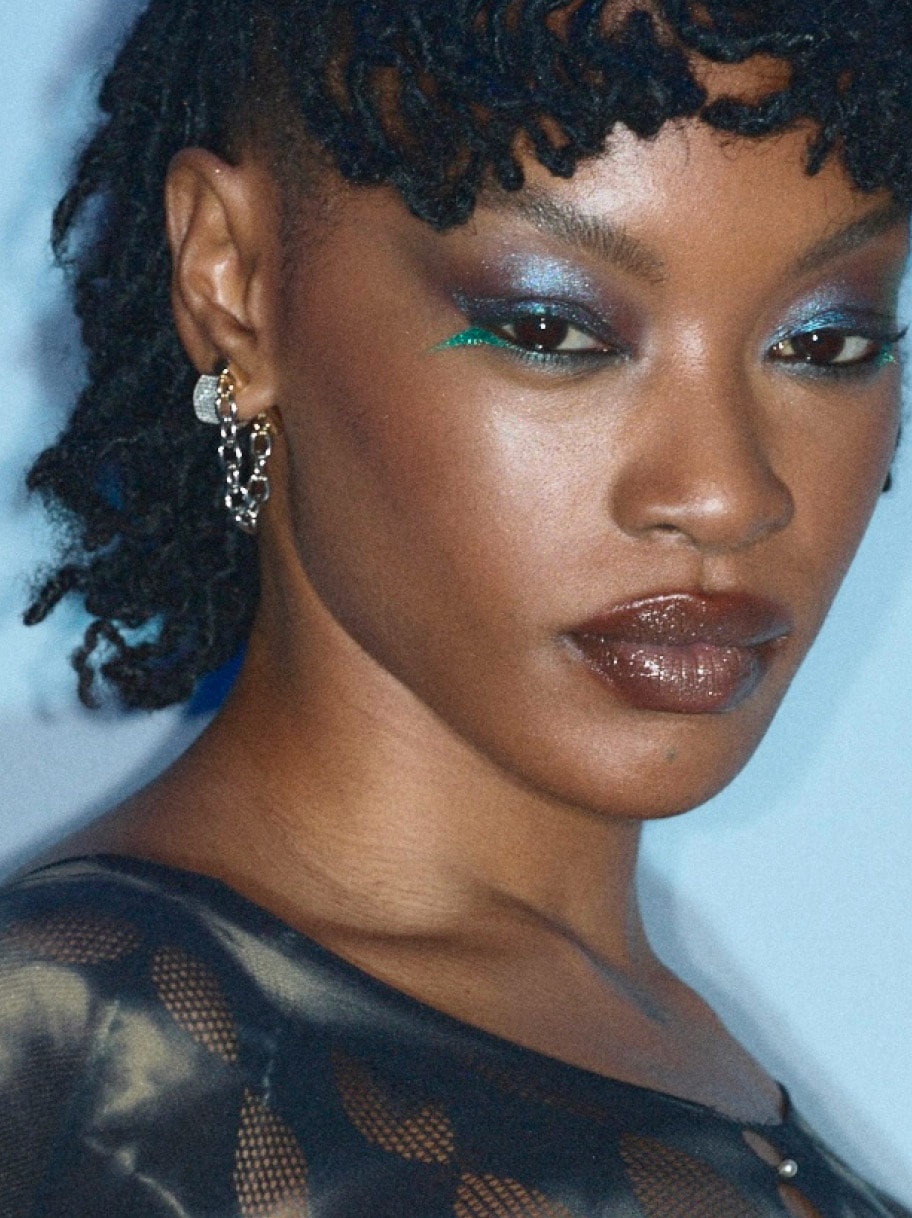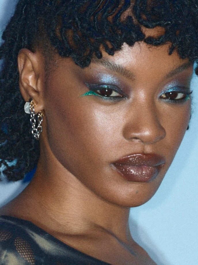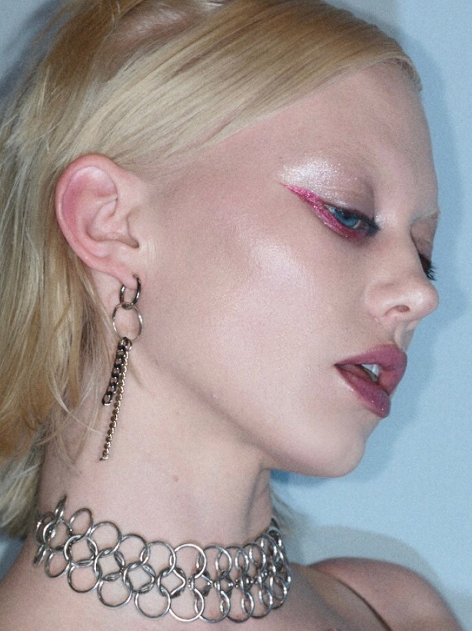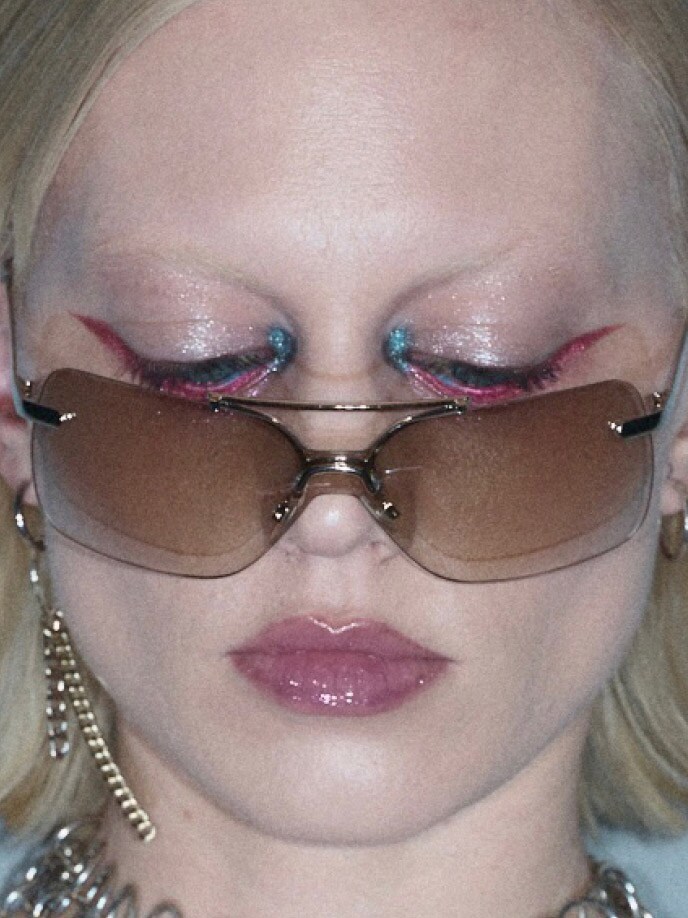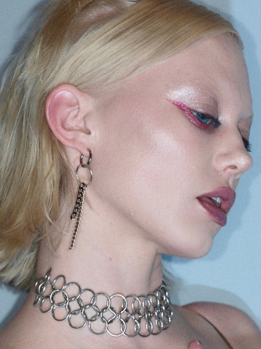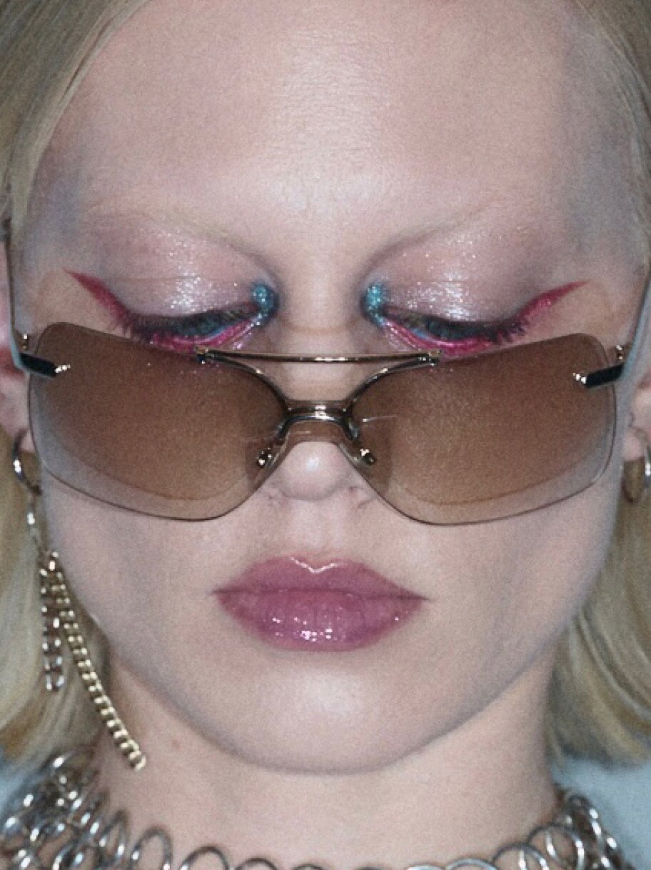 إليكِ آيشادو Shadeshift Chrome و Dazzleshadow Liquid باستخدامه بشكلٍ استراتيجي على خط الرموش السفلية. "كان تلاعباً على الآيلاينر التقليدي. بدلًا من الاتجاه إلى الأعلى، نذهب للأسفل. فعلاً إطلالة مستقبلية وجريئة". تركيبة هذه الدرجات اللونية الميتاليك شبه العاكسة، هي التجسيد الحقيقي لجمالية الخيال المستقبلي.