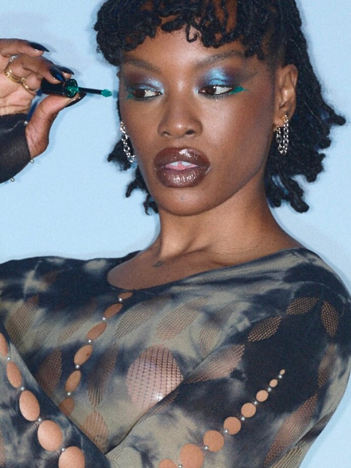 يضفي الآيشادو السائل Dazzleshadow بلون Tourmaline Dream بعداً جديداً تماماً على هذه الإطلالة.